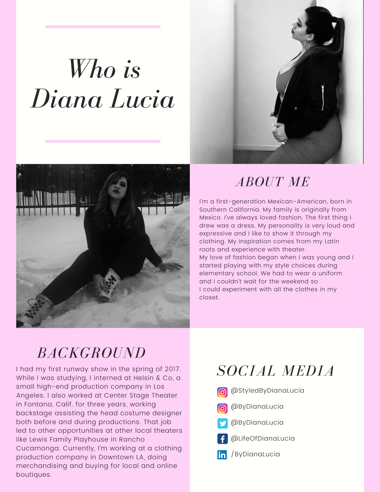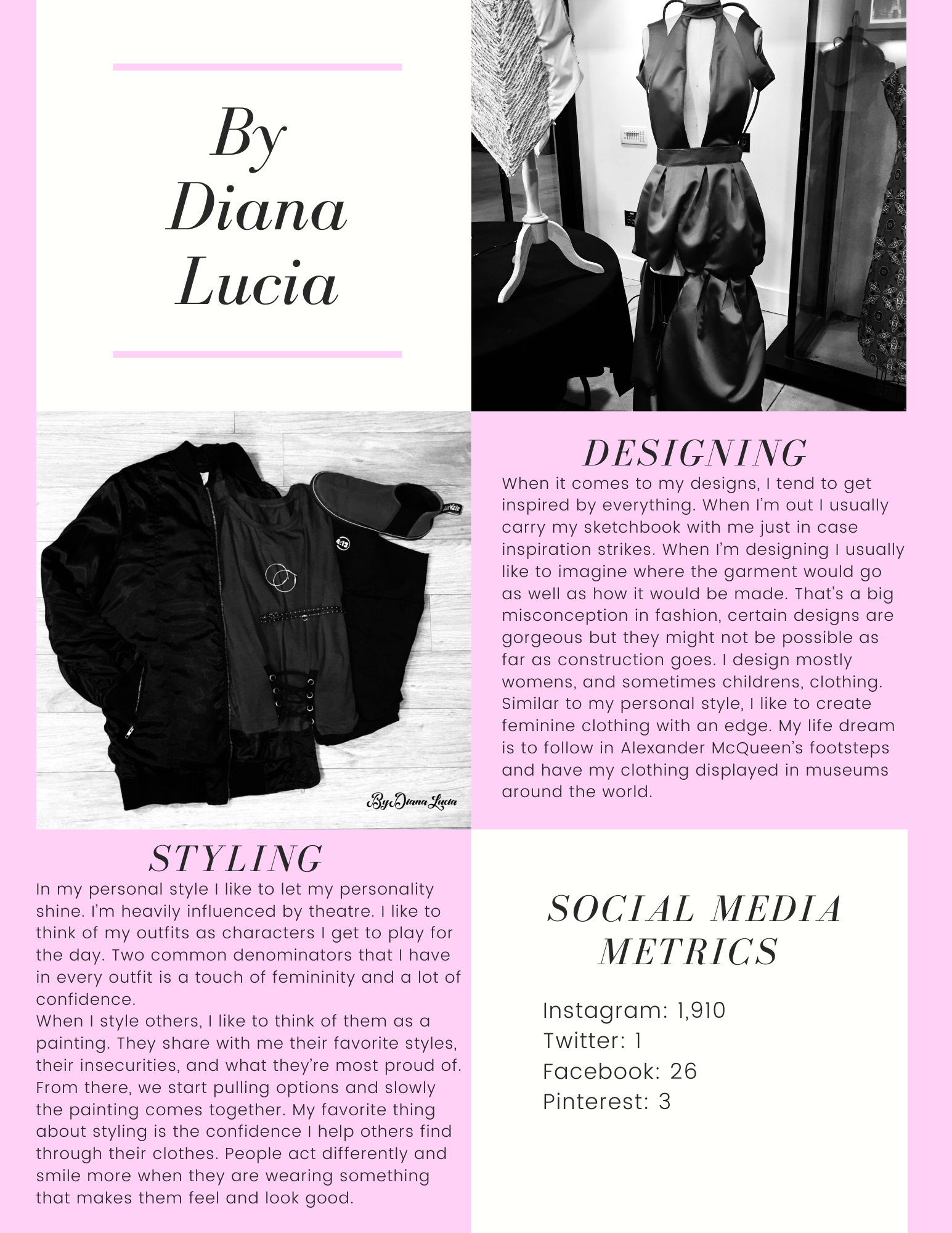 I worked with an up and coming designer and stylist to help her boost her social media presence. I created a social media marketing plan for her based on the SWOT analysis I did for her. I also created two versions for her logo; a simple logo and hand drawn logo, which she used for her design only page.